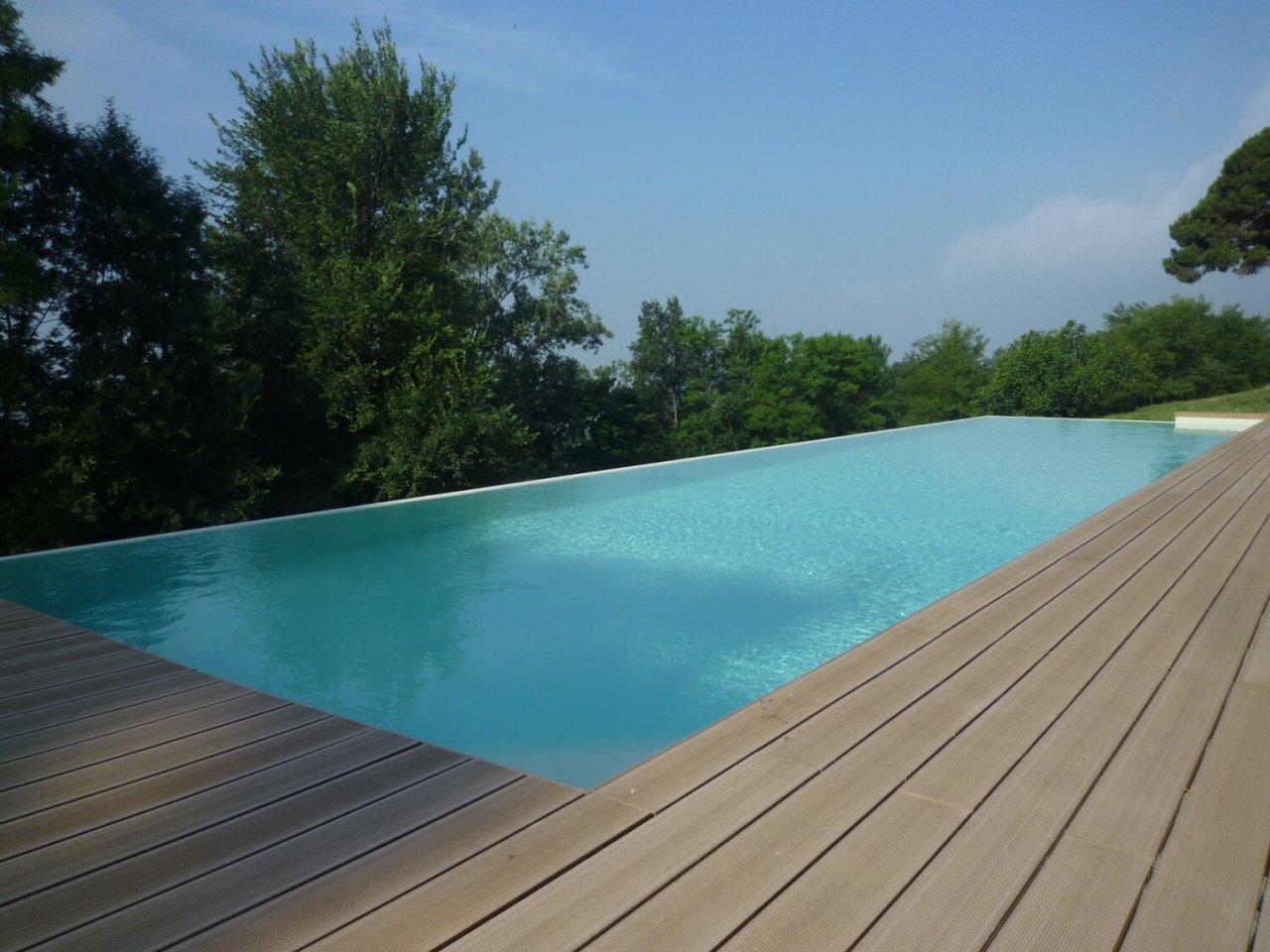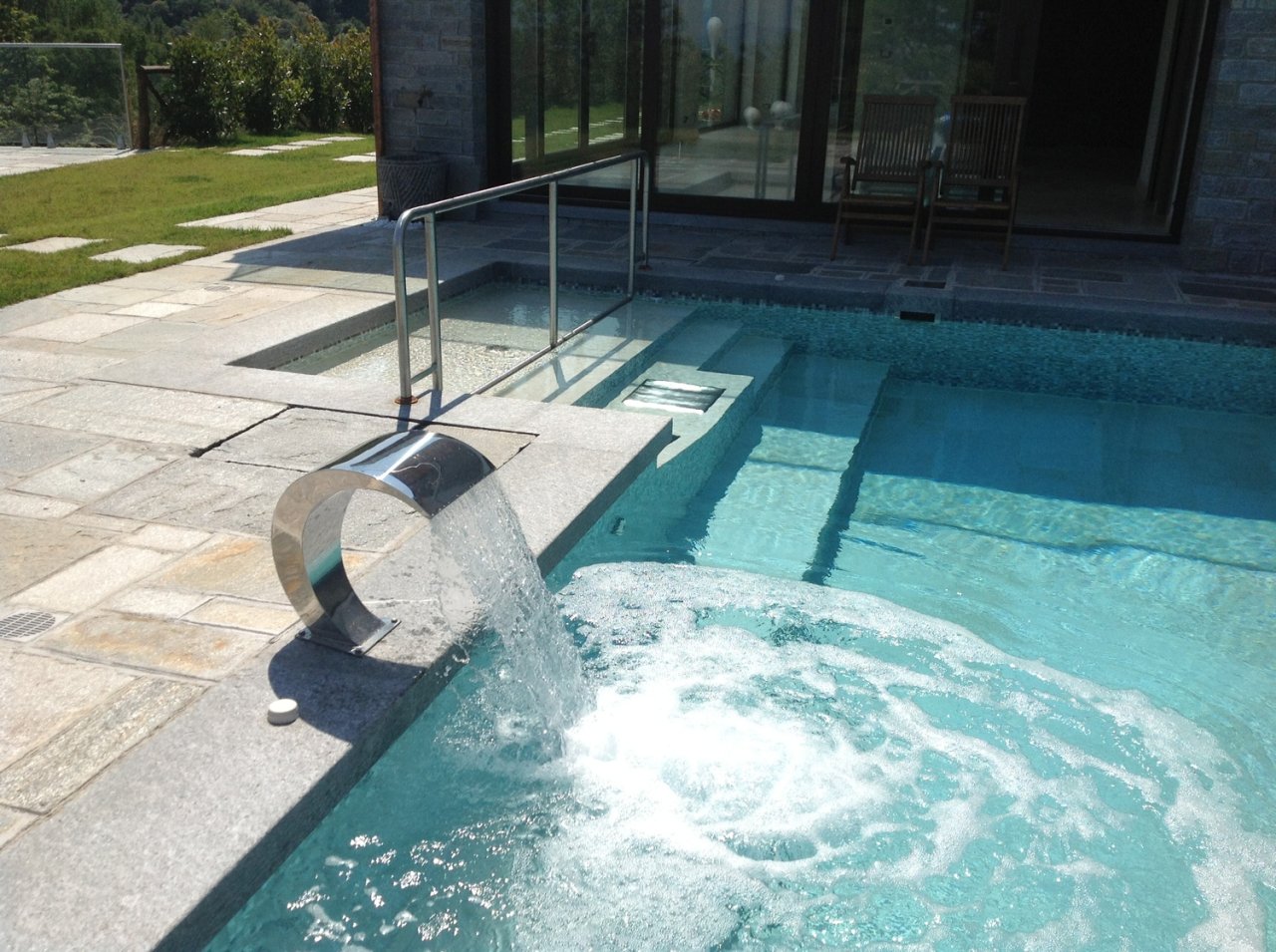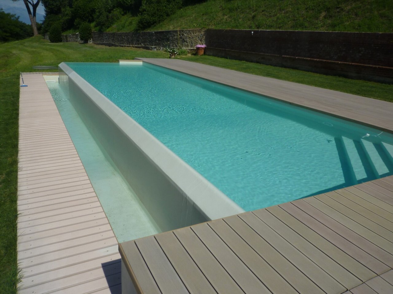 piscina a cascata infinity colore grigio perla con trattamento acqua con elettrolisi salina realizzata da acqua spa