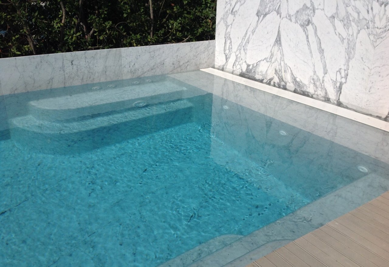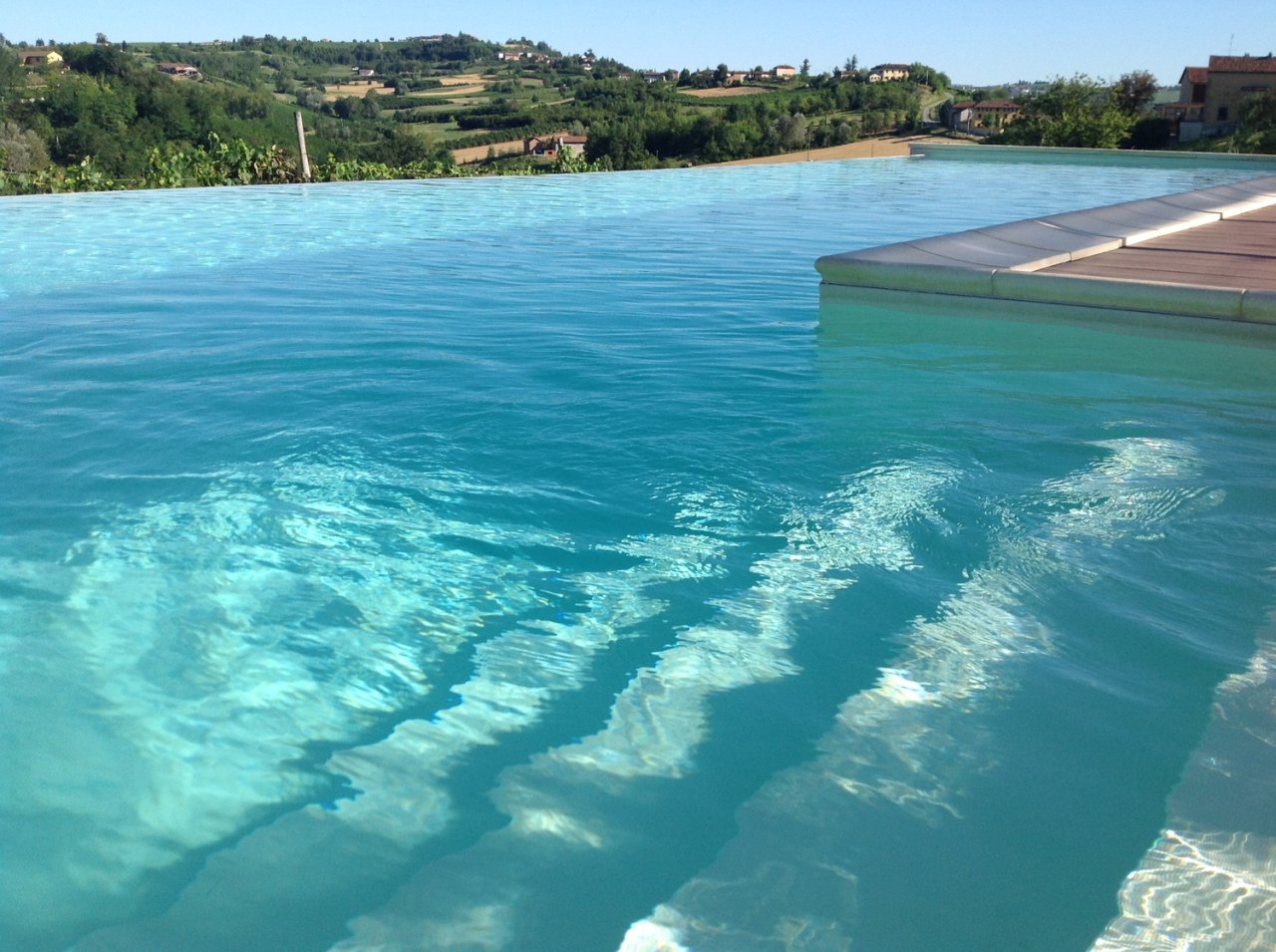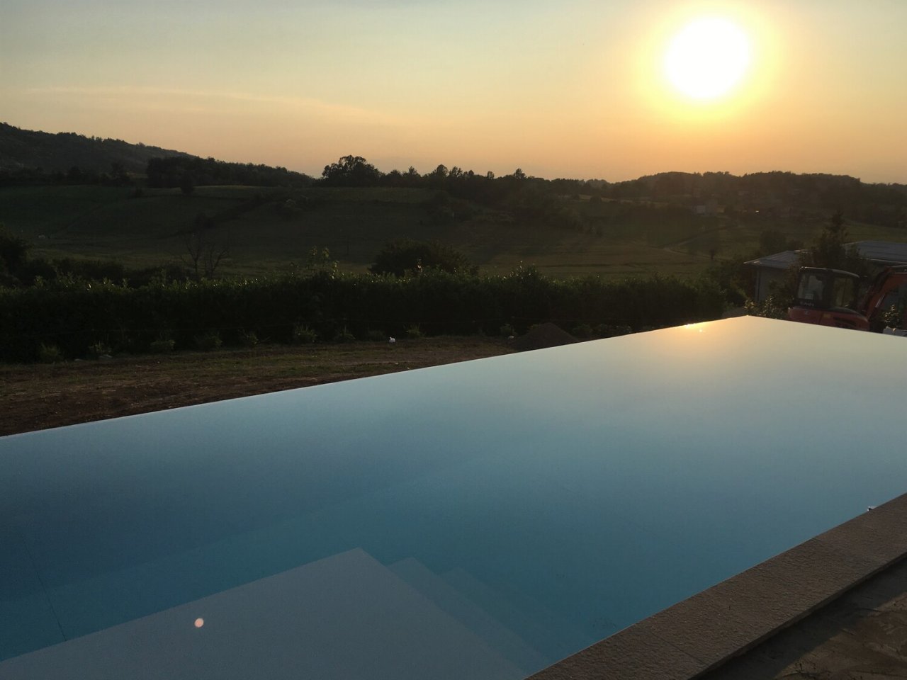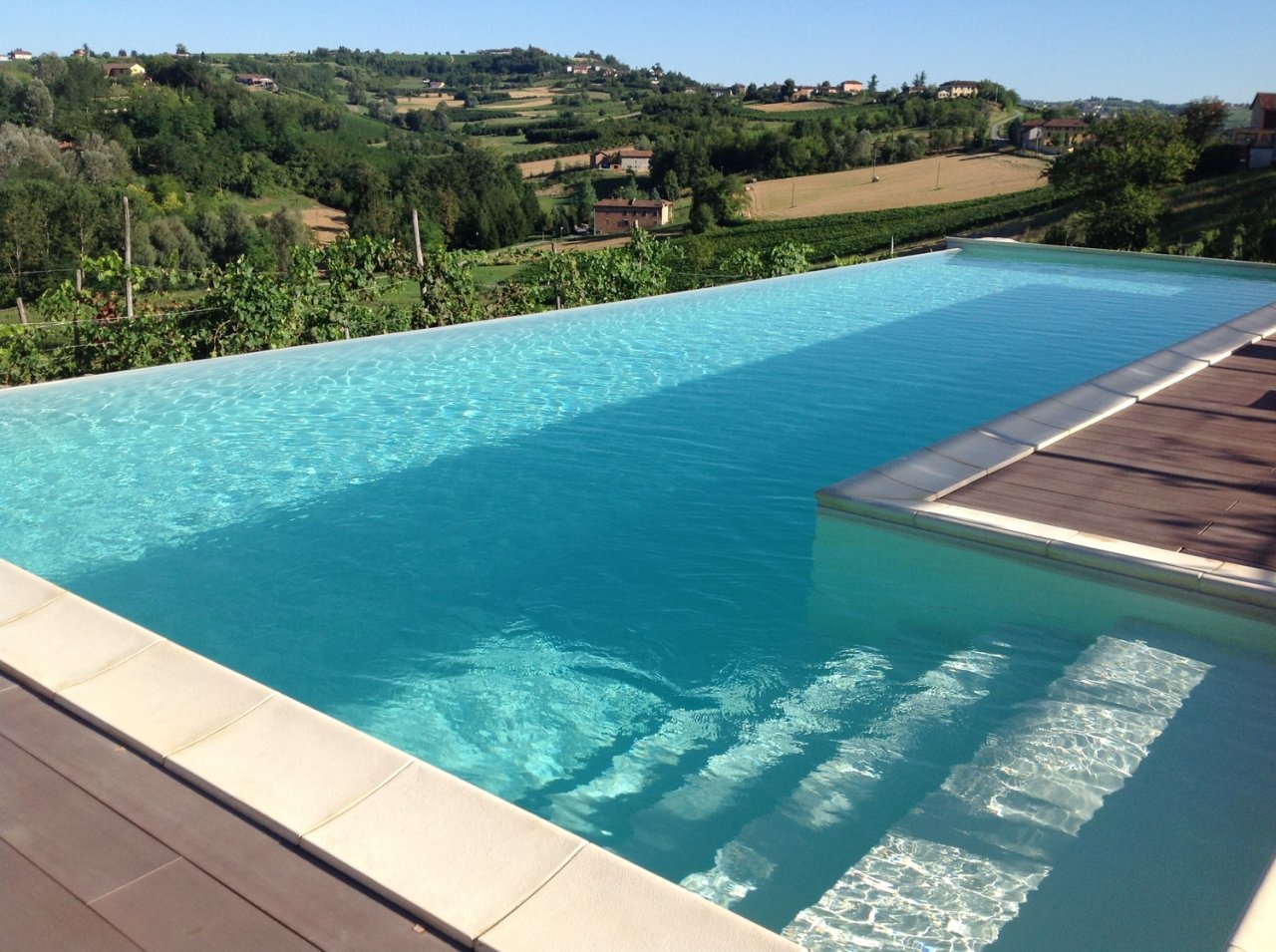 piscina a cascata infinity colore grigio perla con trattamento acqua con elettrolisi salina realizzata da acqua spa