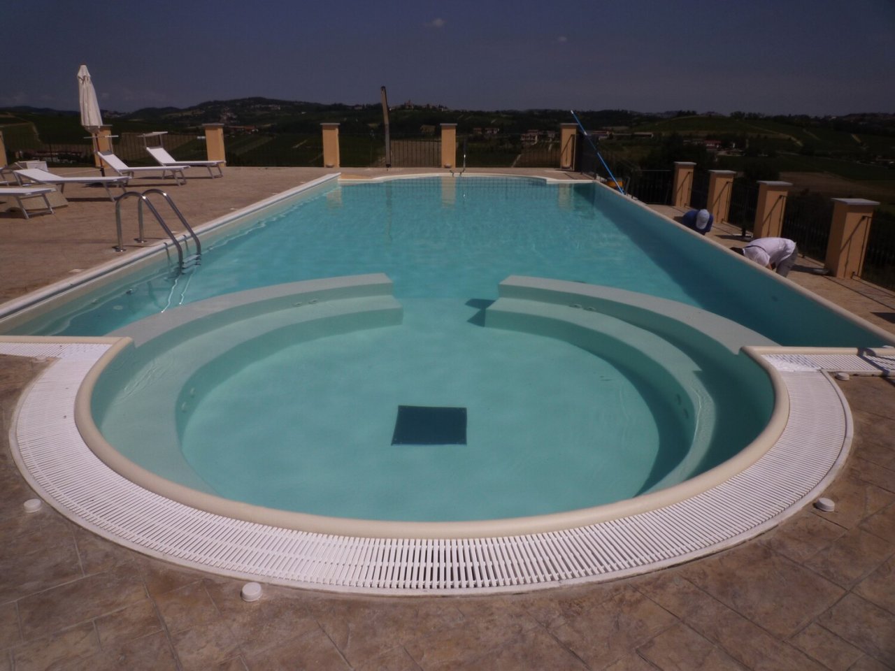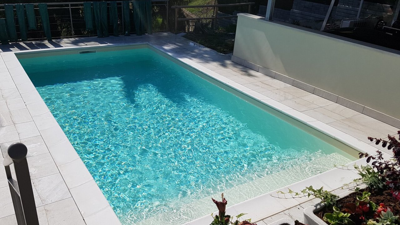 piscina a doppia profondita con scala alla tropezienne e pvc colore sabbia bordo micheletto