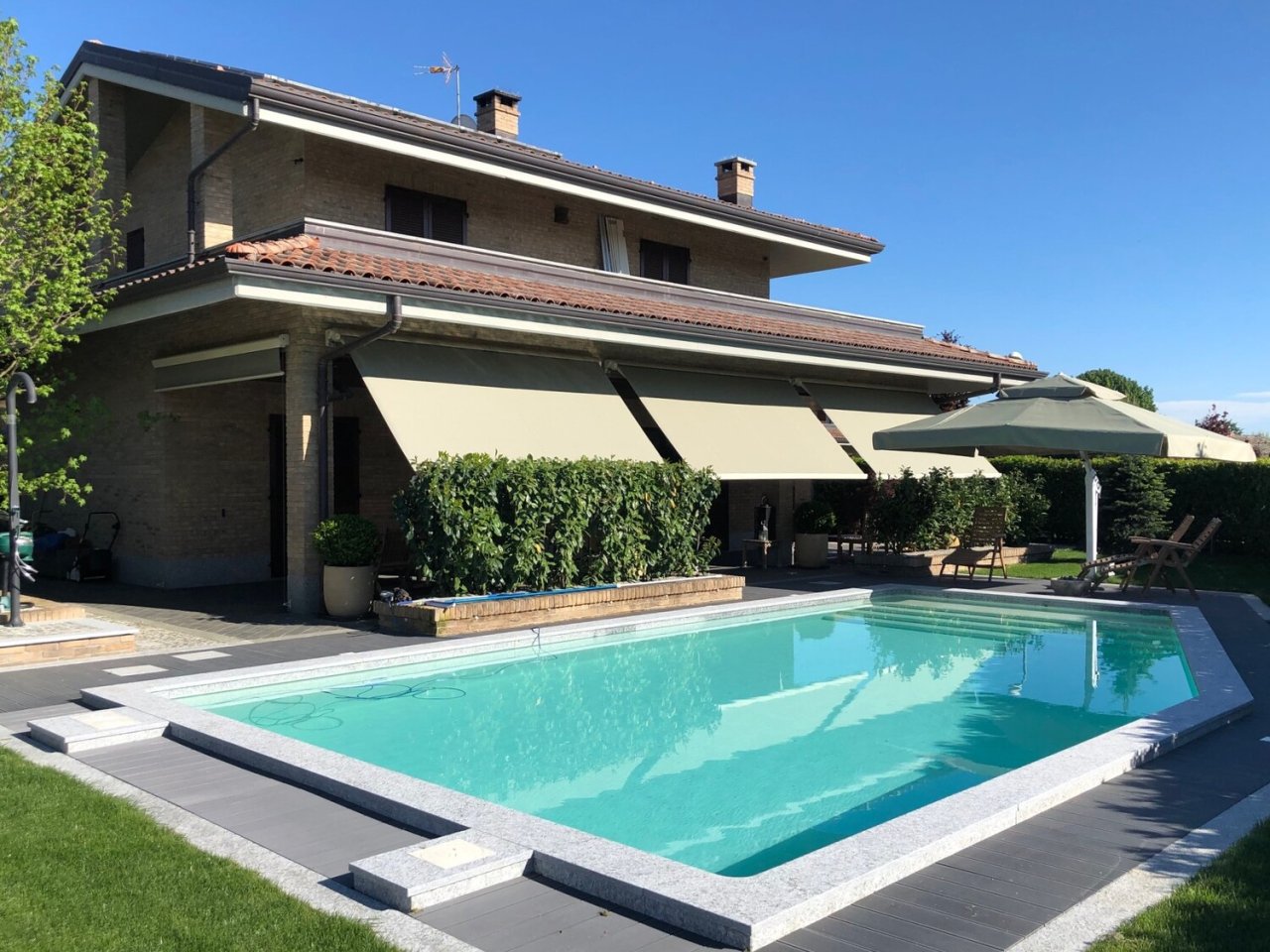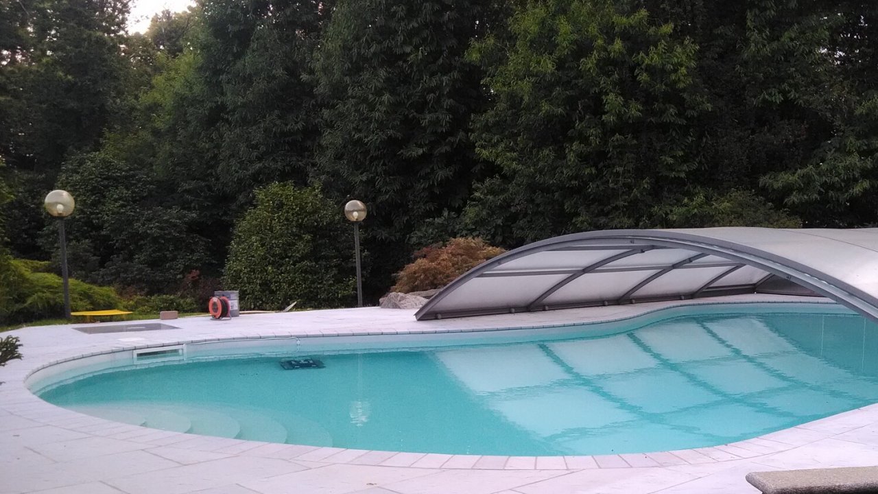 piscina a doppia profondita con scala alla tropezienne e pvc colore sabbia e bordo micheletto e copertura