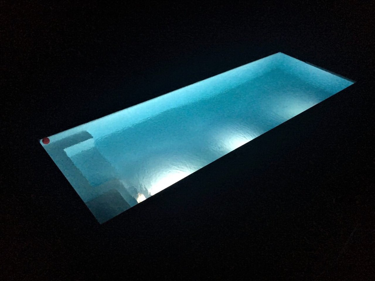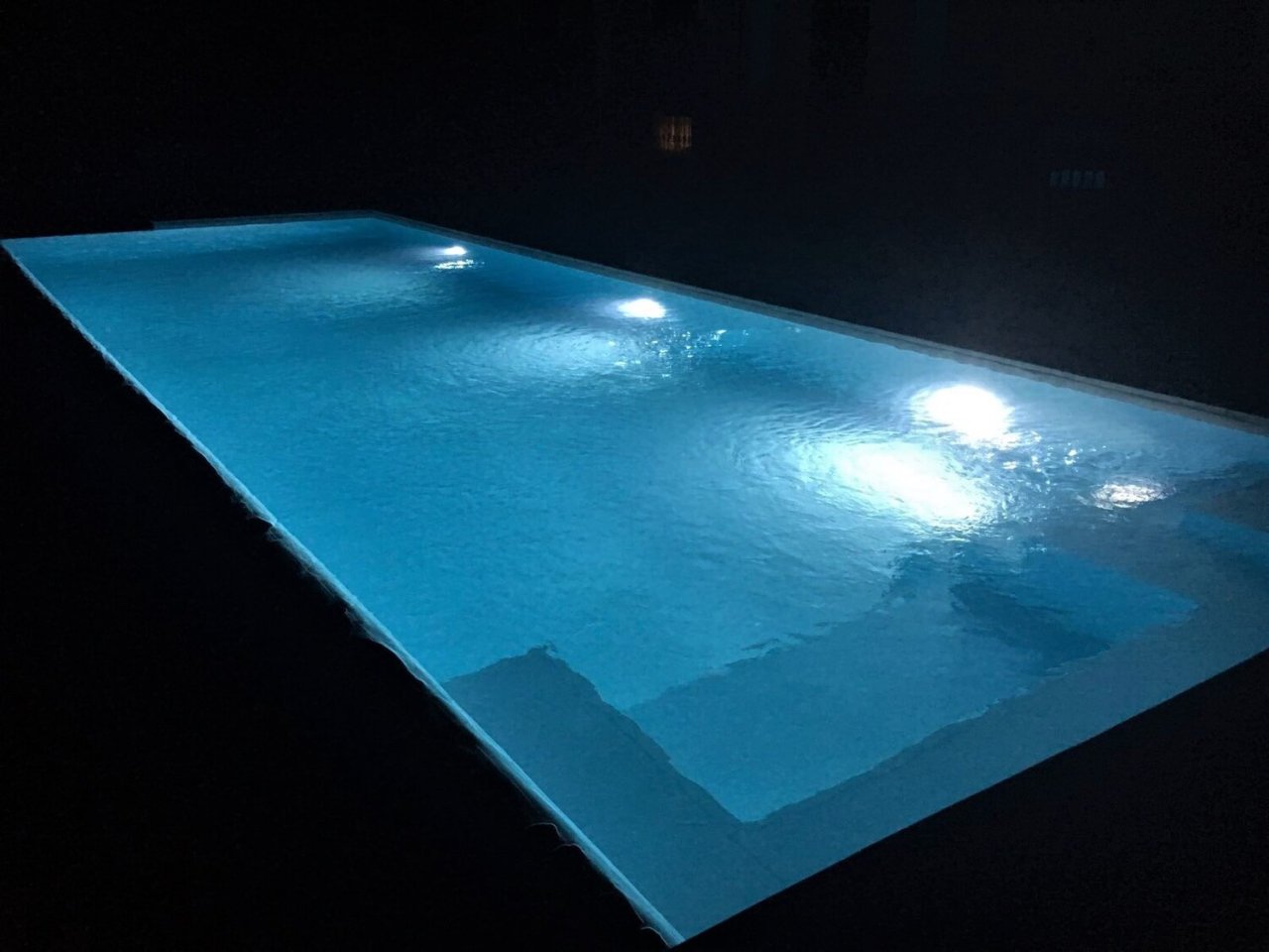 piscina a forma libera con pvc color grigio chiaro con illuminazione rgb