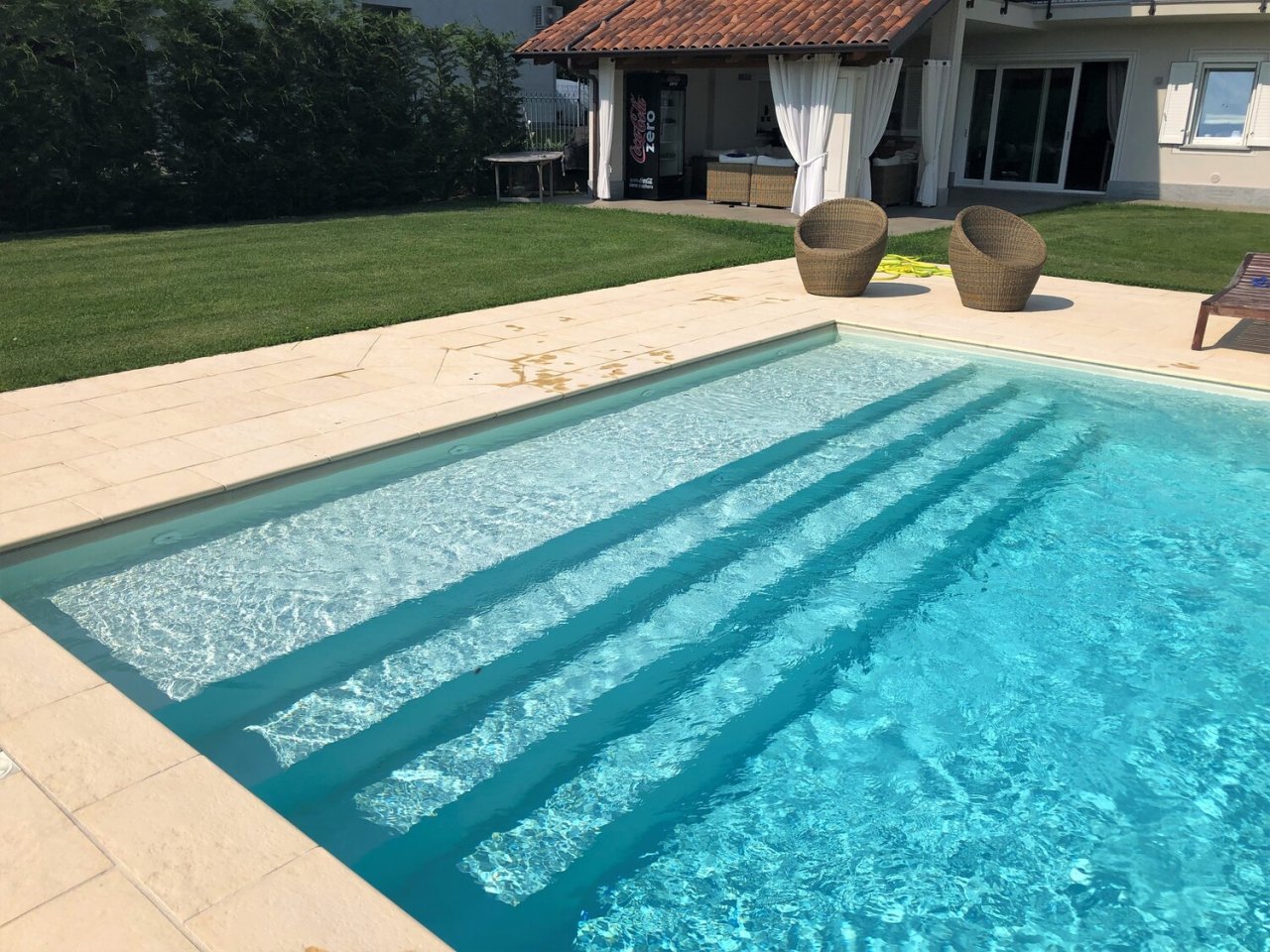 piscina a doppia profondita con scala alla tropezienne pvc colore sabbia e bordo micheletto