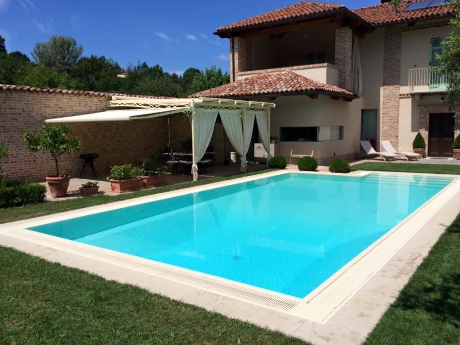 piscina su misura con pvc colore sabbia trattamento acqua con elettrolisi
